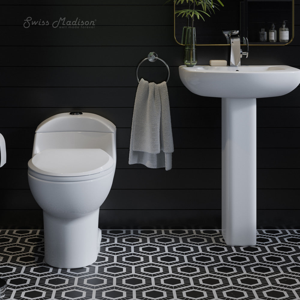 Transform your living spaces into regal abodes with the Chateau collection, embracing grandeur and comfort in every detail. Redefine your bathroom with our one-piece toilet, combining seamless design and functionality for a truly modern upgrade. Offered in white with a glossy finish and black hardware.