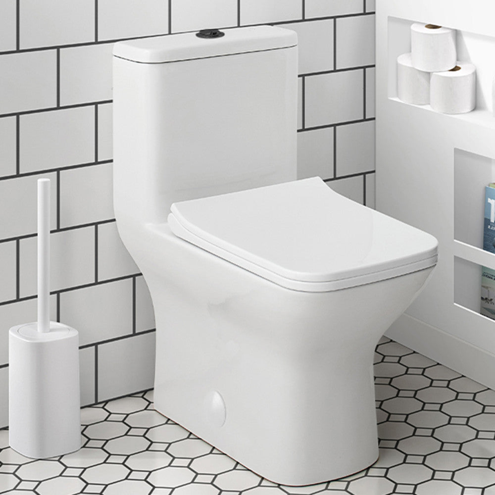 Embrace geometric balance with the Carre collection, where clean lines and modern design principles take center stage. Redefine your bathroom with our one-piece toilet, combining seamless design and functionality for a truly modern upgrade. Offered in white with a glossy finish and black hardware.