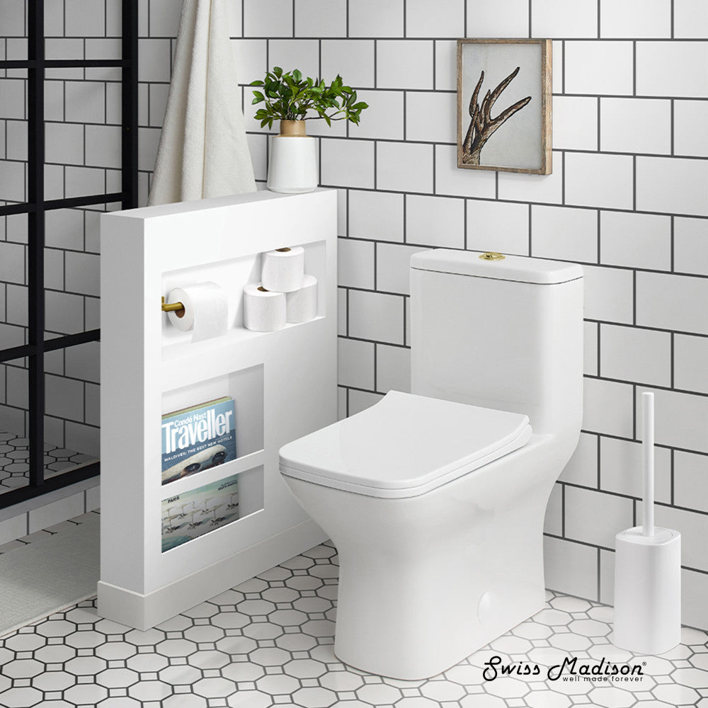 Embrace geometric balance with the Carre collection, where clean lines and modern design principles take center stage. Redefine your bathroom with our one-piece toilet, combining seamless design and functionality for a truly modern upgrade. Offered in white with a glossy finish and brushed gold hardware.