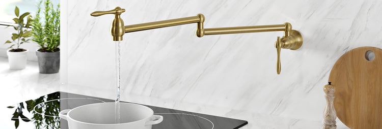 Wall-mounted pot filler faucets offer convenient access to water for filling large pots at the stove.