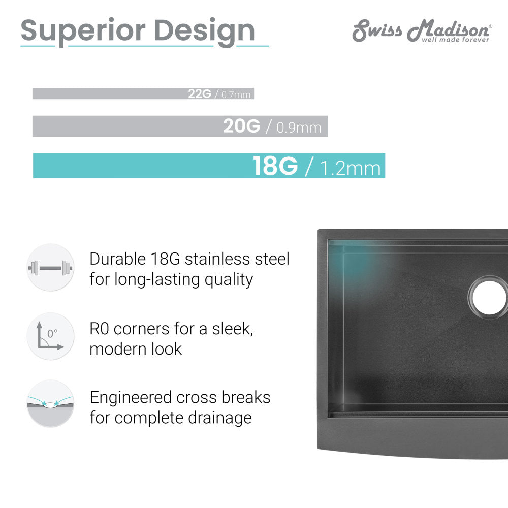Discover the art of curves and lines with the Tourner collection, where fluid designs redefine contemporary aesthetics. Infuse rustic charm and modern convenience into your kitchen with our farmhouse sinks, blending traditional appeal with contemporary utility. Offered in stainless steel with a black finish.