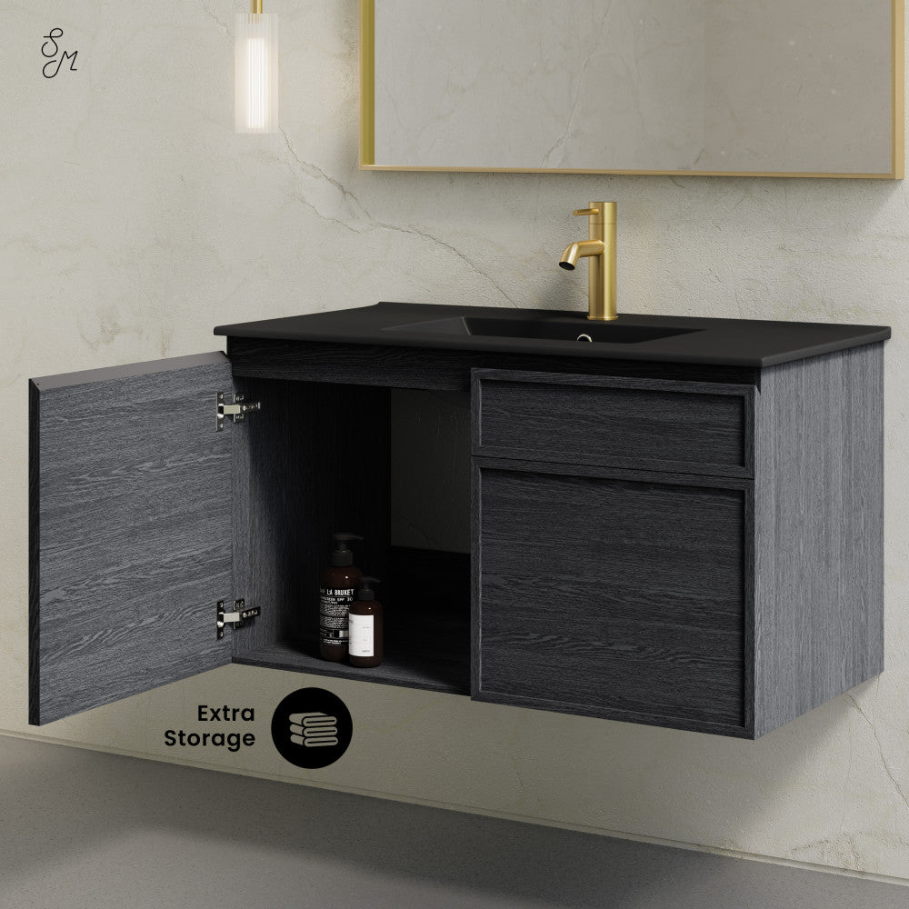 St. Tropez 36" Wall-Mounted Bathroom Vanity in Black Oak with Black Sink Top
