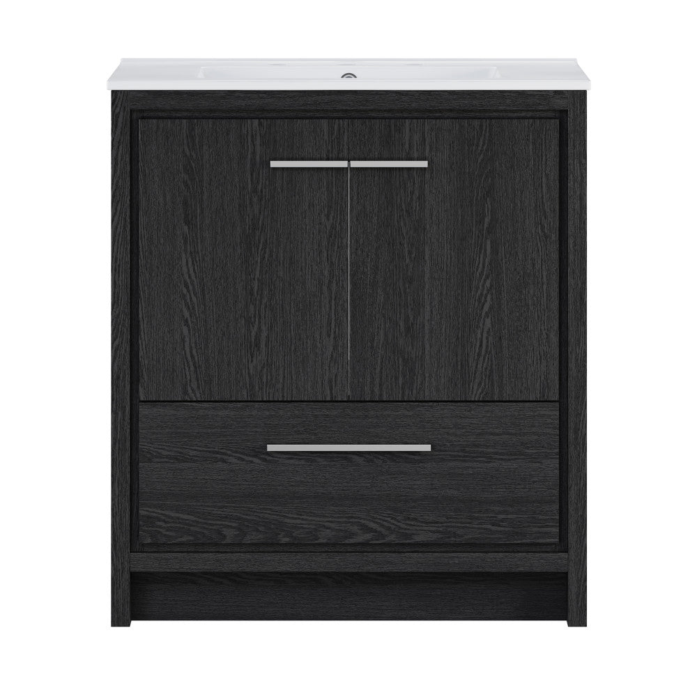 Feel the excitement of movement and transition in the Virage collection, where dynamic designs captivate. Transform your bathroom into a sanctuary of style and functionality with our exquisite bathroom vanities, meticulously crafted to reflect your unique taste. Offered in black oak with a glossy white sink top.