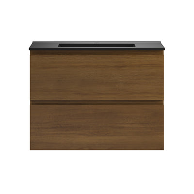 Liberte 30" Wall-Mounted Bathroom Vanity in Brown Oak with Black Sink Top