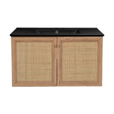 Classe 36 in. Brown Oak Wall Hung Bathroom Vanity With Black, 3-Hole Ceramic Sink Top