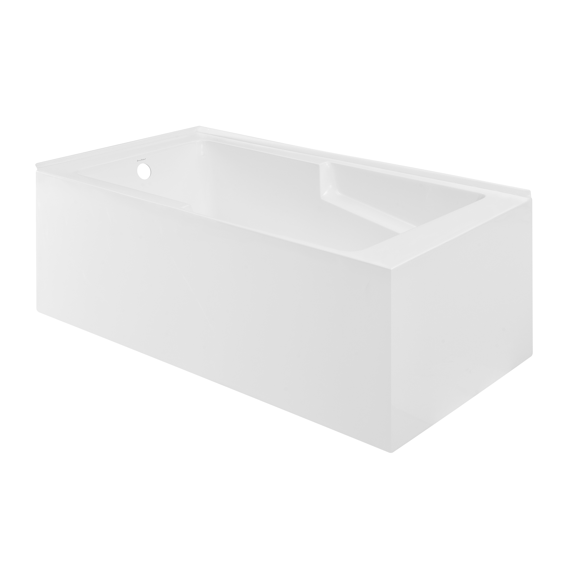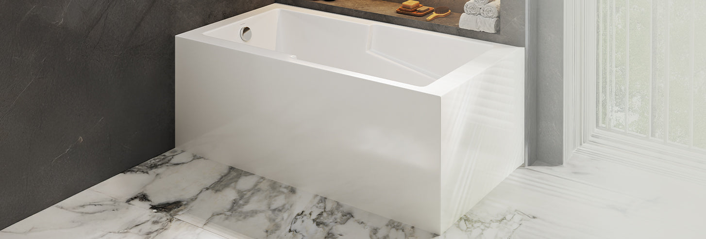 Alcove bathtubs are the most common type of bathtub found in the US. This bathtub is installed into a 3-wall alcove, which means only the front side of the bathtub is accessible. These models are not reversible due to their integral tile flange, so it is important you select a tub with the proper drain location to match your existing plumbing. There are two types of alcove bathtubs; one with a built-in apron and one without. An alcove bathtub that does not include a built-in apron requires that one be built to cover the exposed side of the tub.
