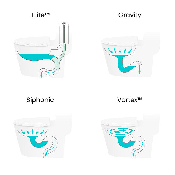 Swiss Madison offers 4 different kinds of flush technology on our toilets: