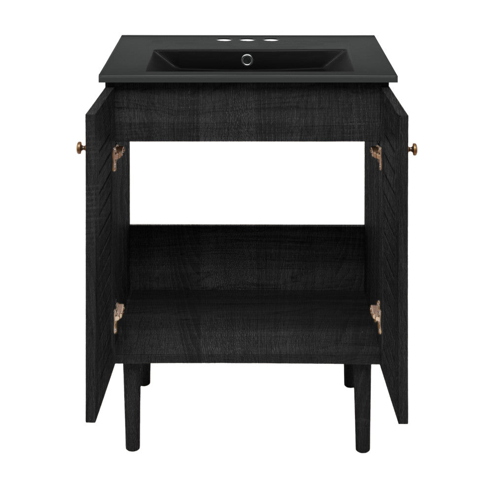 Celebrate the allure of bronze in the Bron collection, where metallic accents and modern elements converge. Tailor your bathroom to perfection with our cabinets-only vanities, offering customizable vanity top solutions to integrate with your design vision. Offered in black oak with a matte black sink top.