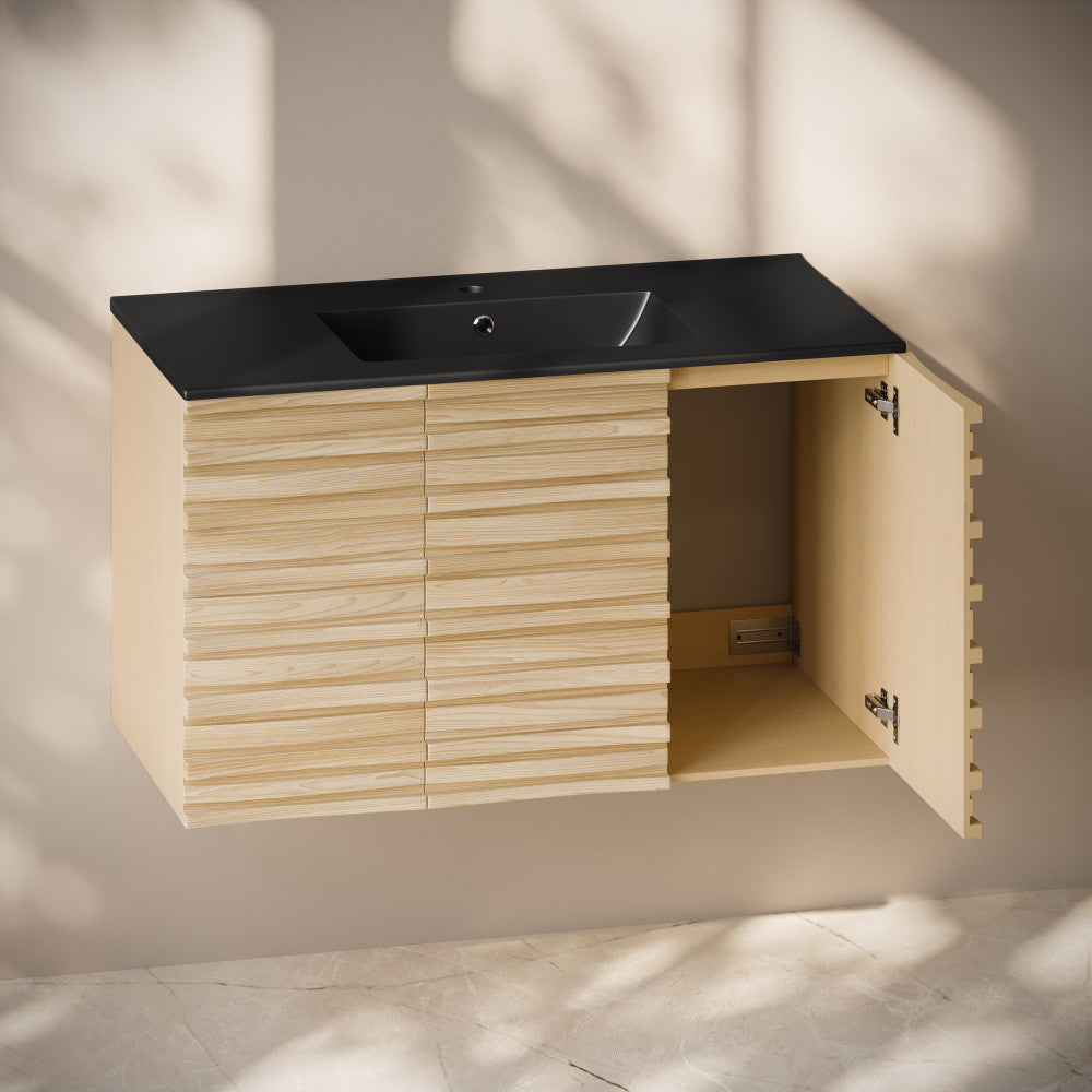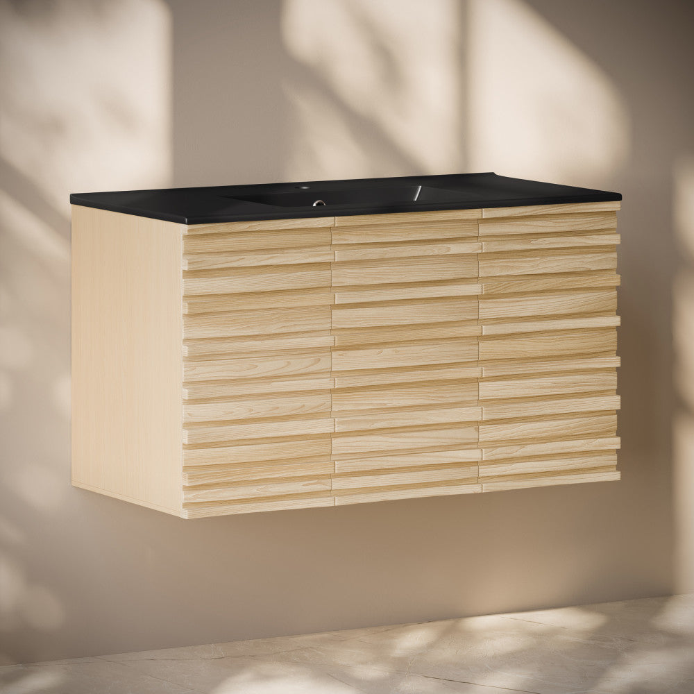 Immerse yourself in the gentle flow of design with the Cascade collection, where fluid lines and captivating forms create an atmosphere of tranquil beauty. Transform your bathroom into a sanctuary of style and functionality with our exquisite bathroom vanities, meticulously crafted to reflect your unique taste. Offered in natural oak with a matte black sink top.