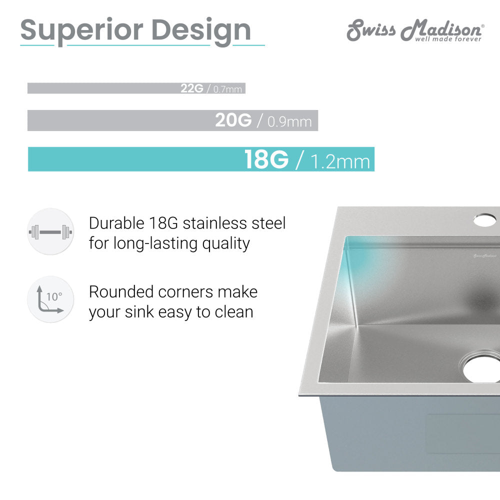 - Top-Mount Installation: The top-mount rim allows the sink to rest on top of the countertop.