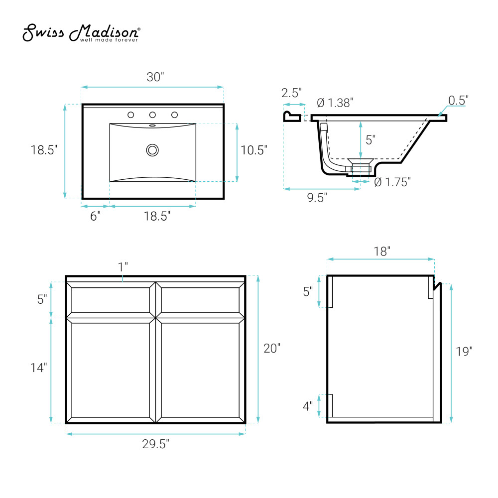 - Faucet hole: Pre-drilled standard 1 3/8”