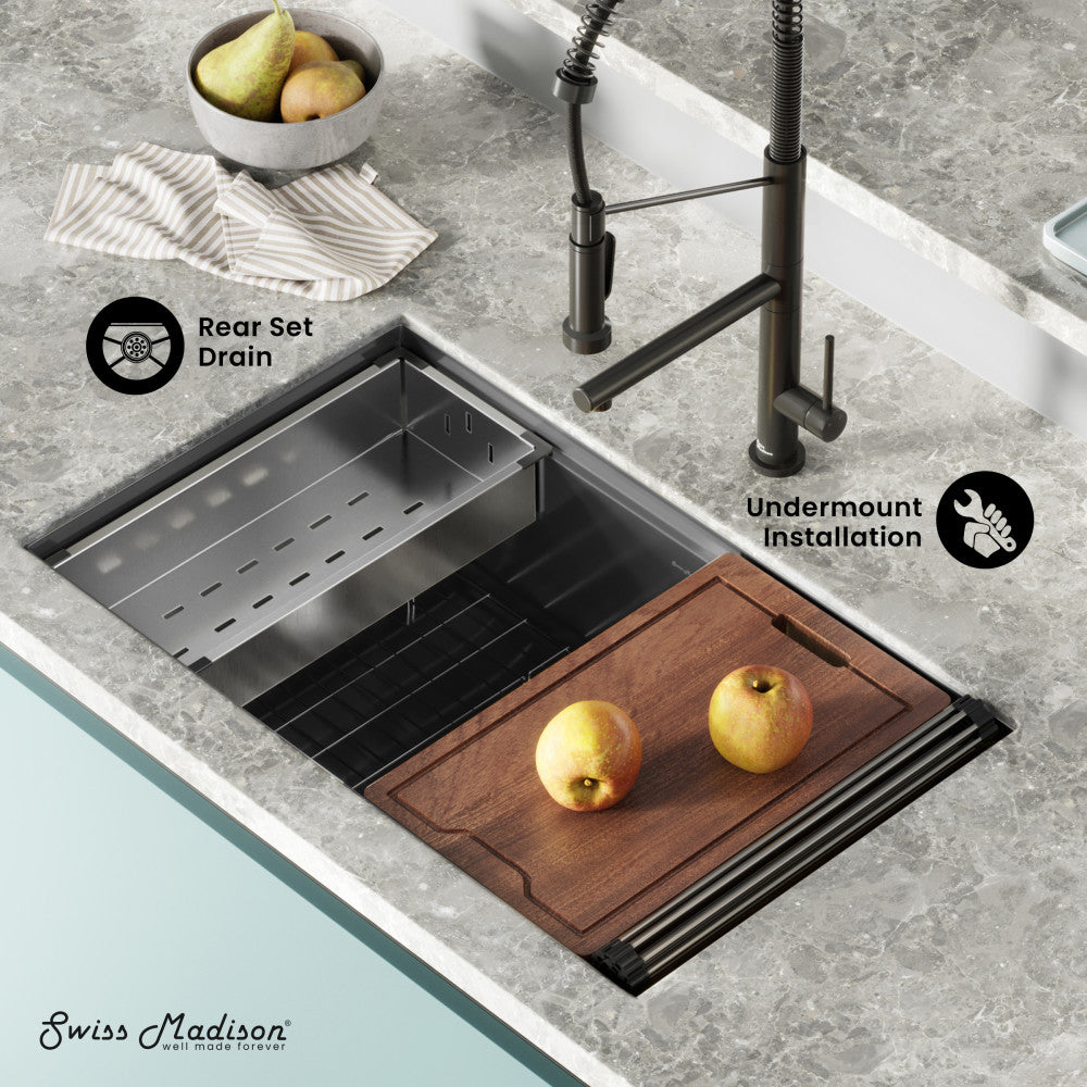 Discover the art of curves and lines with the Tourner collection, where fluid designs redefine contemporary aesthetics. Elevate your kitchen aesthetics with our undermount sinks, showcasing sleek design and maximum counter space. Offered in stainless steel with a black finish.