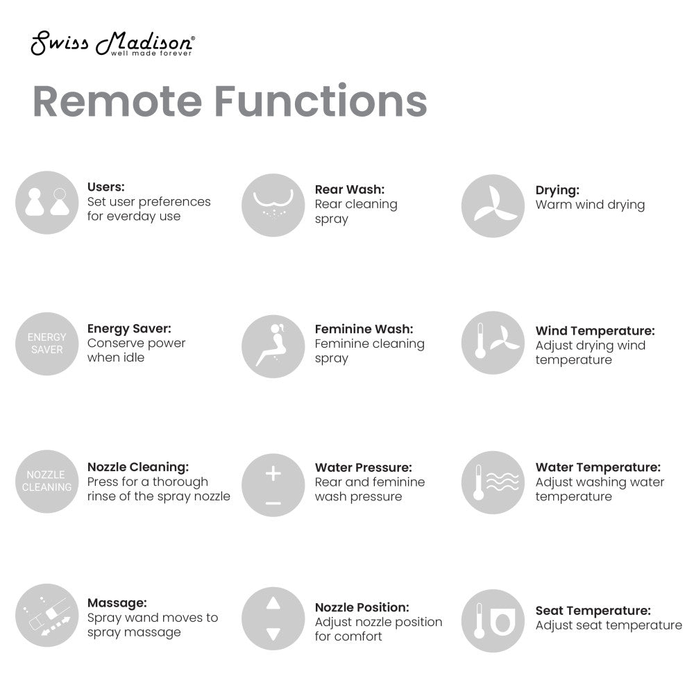 - Remote and Side Control Options: Full remote control and an integrated side panel to easily manage bidet functions directly from the side of the seat