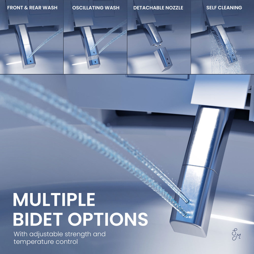 - Bidet Features: Offers adjustable front and rear wash, customizable water temperature and pressure, oscillating spray for thorough cleansing, adjustable oscillating warm air dryer, and a self-cleaning detachable nozzle